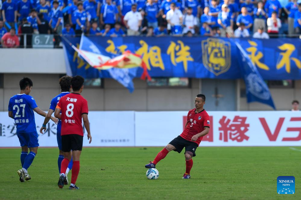 Dai Hu, 39-year-old, secretary of the Communist Party of China (CPC) branch of Hanchen Village of Lianshui County in Huai'an City, east China's Jiangsu Province and also a football fullback of Huai'an Team, made his debut at home as a substitute in the final minutes of the match in the fourth round of the "Su Super" league.