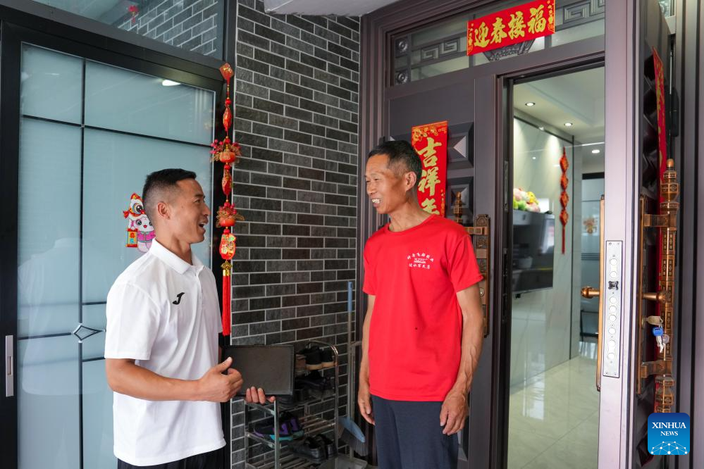 Dai Hu (L) visits a villager in Hanchen Village of Lianshui County in Huai'an City, east China's Jiangsu Province, June 23, 2025. (Xinhua/Li Bo)