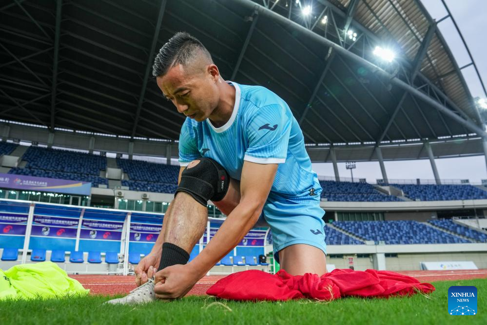 Dai Hu gears up before a football training session in the stadium of Huai'an Olympic Center in Huai'an City, east China's Jiangsu Province, June 23, 2025. (Xinhua/Li Bo)