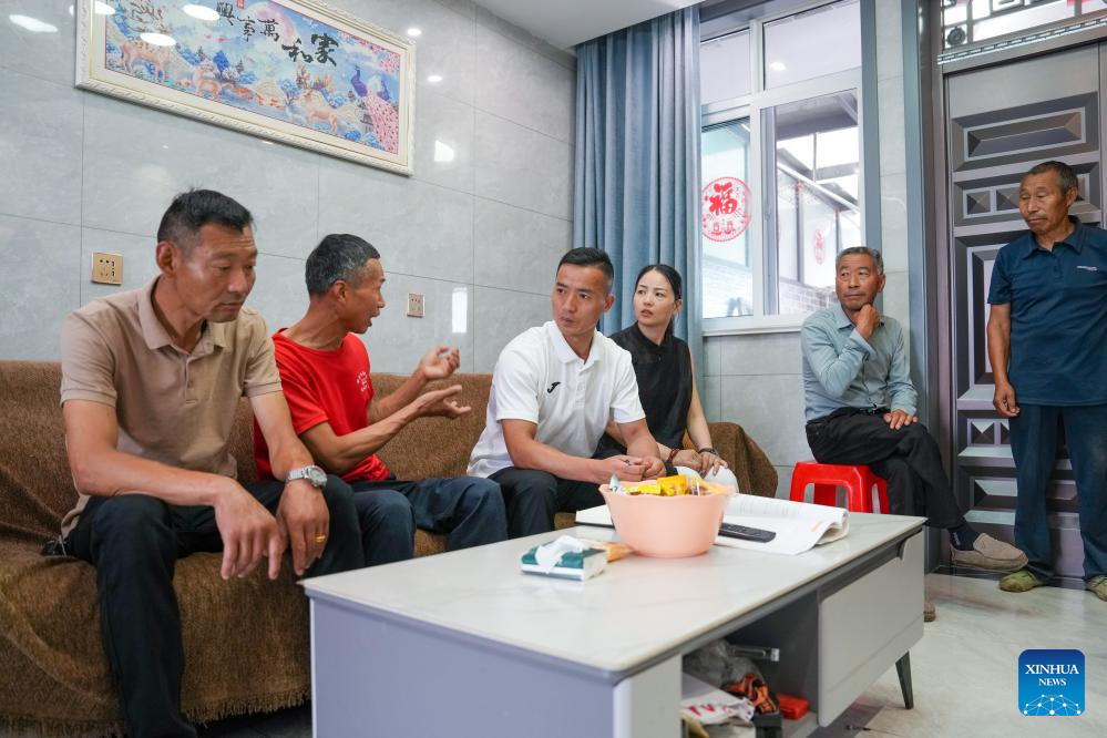 Dai Hu (3rd L) and his colleagues visits a villager in Hanchen Village of Lianshui County in Huai'an City, east China's Jiangsu Province, June 23, 2025. (Xinhua/Li Bo)
