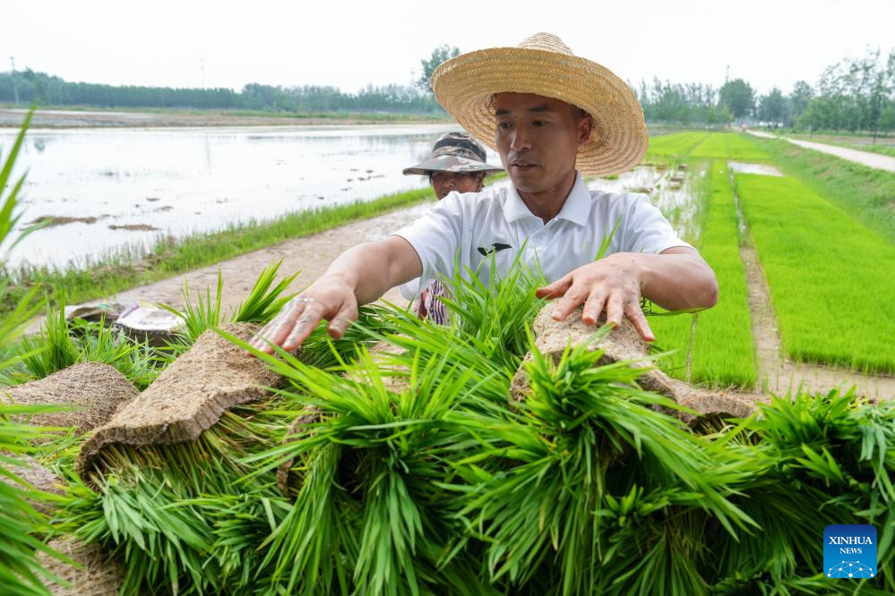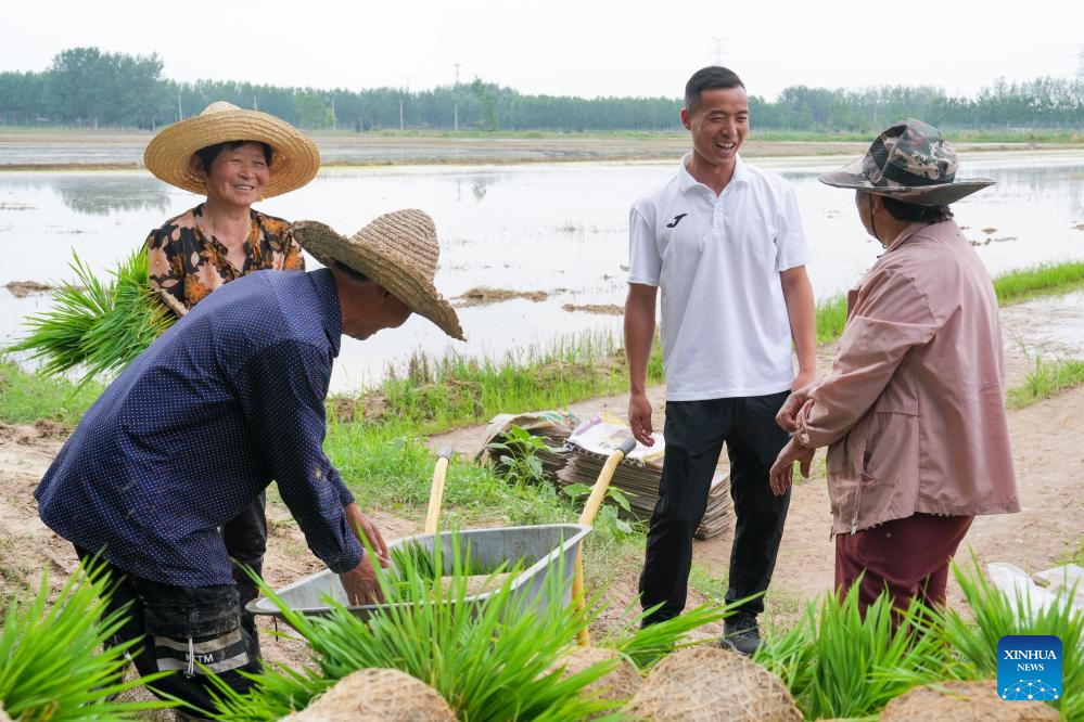 Dai Hu helps villagers in a paddy rice field in Hanchen Village of Lianshui County in Huai'an City, east China's Jiangsu Province, June 23, 2025. (Xinhua/Li Bo)