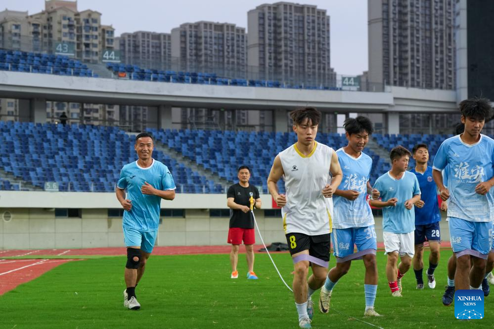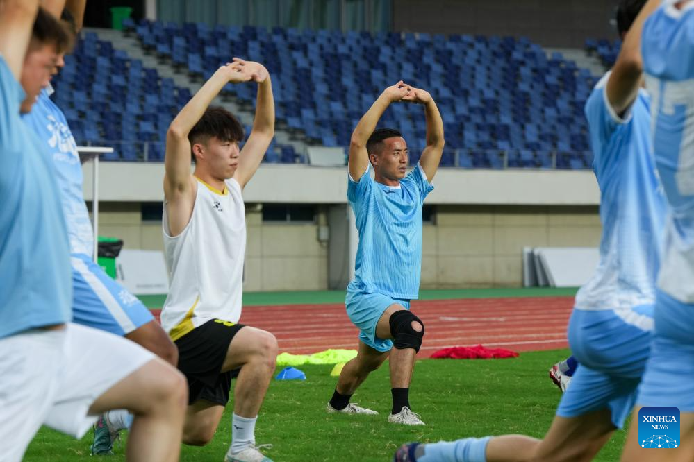 Dai Hu (C) warms up with teammates of Huai'an Team during a football training session in the stadium of Huai'an Olympic Center in Huai'an City, east China's Jiangsu Province, June 23, 2025. (Xinhua/Li Bo)