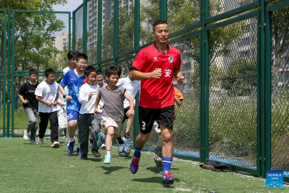 Dai Hu (1st R) warms up with children before a football training session in Hanchen Village of Lianshui County in Huai'an City, east China's Jiangsu Province, June 22, 2025. (Xinhua)