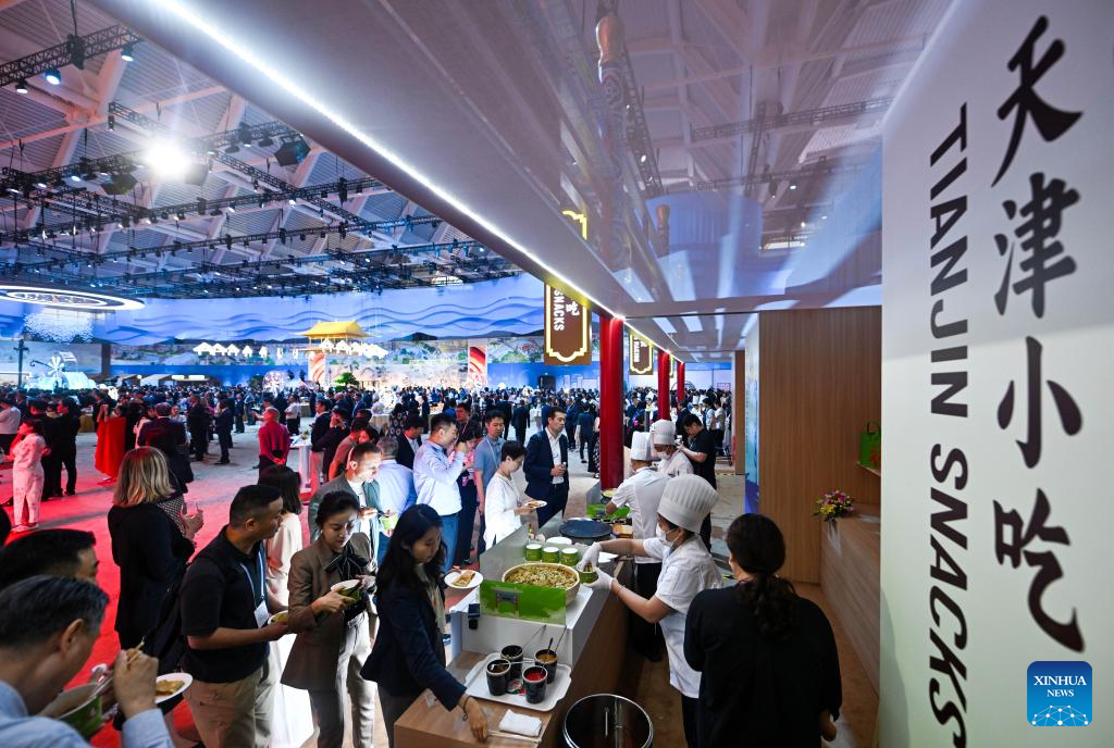 Guests taste snacks of Tianjin during the Cultural Soiree of the 16th Annual Meeting of the New Champions, also known as the Summer Davos, in north China's Tianjin Municipality, June 25, 2025. Attendees learned about traditional Chinese culture, tasted characteristic food of Tianjin and enjoyed performances at the event. (Xinhua/Zhao Zishuo)
