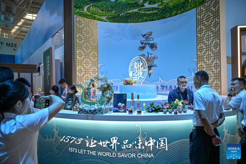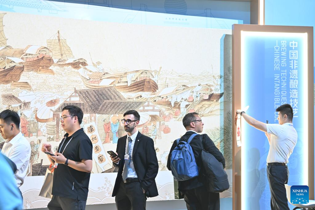 Guests queue at the exhibition booth of traditional brewing techniques during the Cultural Soiree of the 16th Annual Meeting of the New Champions, also known as the Summer Davos, in north China's Tianjin Municipality, June 25, 2025. Attendees learned about traditional Chinese culture, tasted characteristic food of Tianjin and enjoyed performances at the event. (Xinhua/Li Ran)