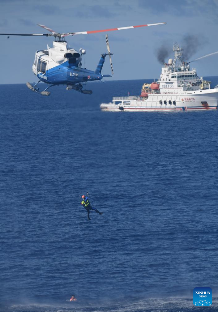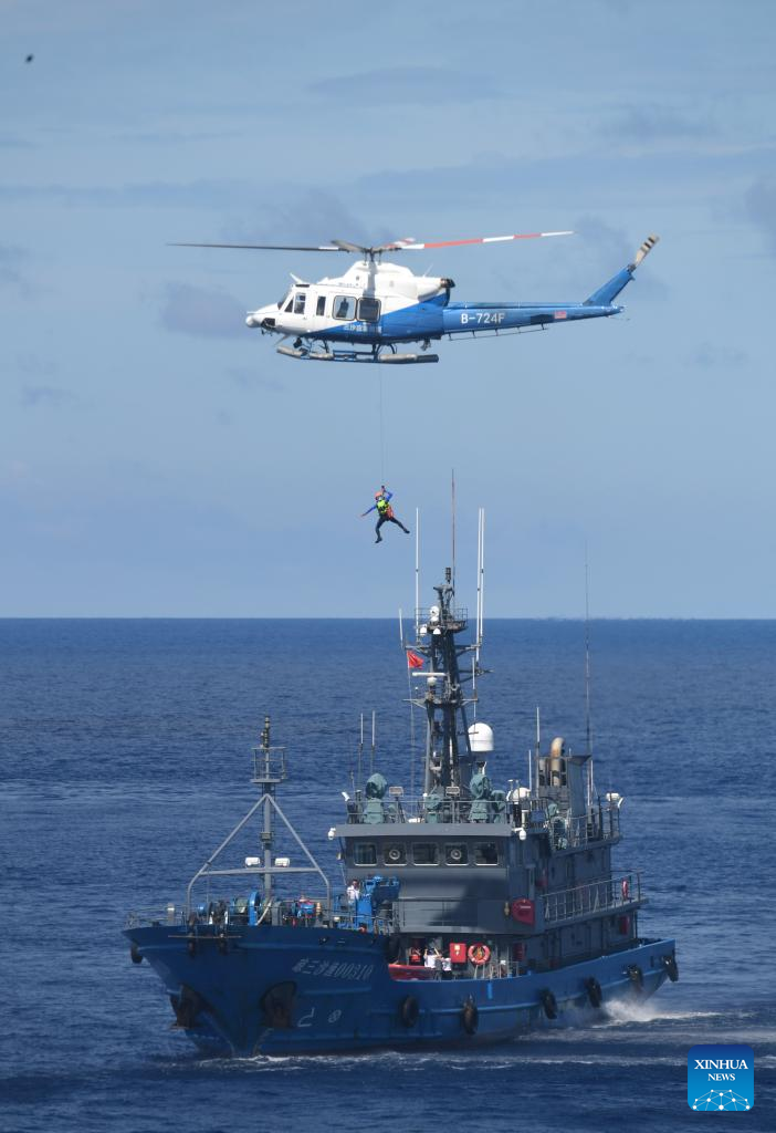 A comprehensive maritime emergency rescue drill of Sansha City is conducted in the waters near Yongxing Island of the Xisha Islands, south China's Hainan Province, June 26, 2025. The drill involved 15 vessels, 2 rescue helicopters and over 200 rescue personnel. (Xinhua/Zhao Yingquan)