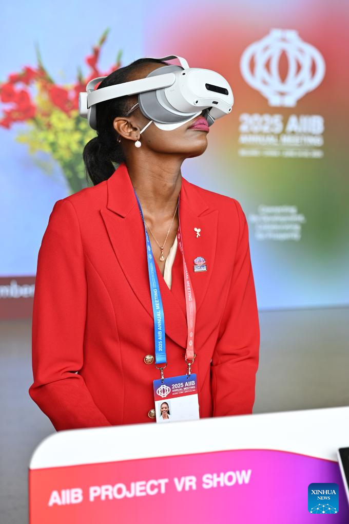 A guest experiences VR glasses at the 10th Annual Meeting of the Asian Infrastructure Investment Bank (AIIB) Board of Governors in Beijing, capital of China, June 26, 2025. Under the theme of "Connecting for Development, Collaborating for Prosperity" and participated by over 3,500 guests from about 100 countries and regions, the 10th Annual Meeting of the AIIB Board of Governors held its opening ceremony in Beijing on Thursday. (Xinhua/Li Xin)