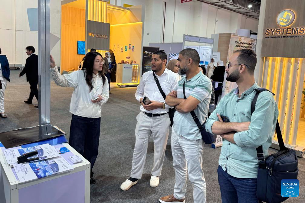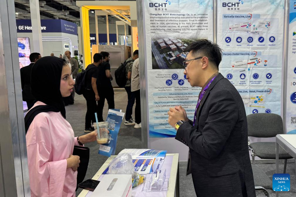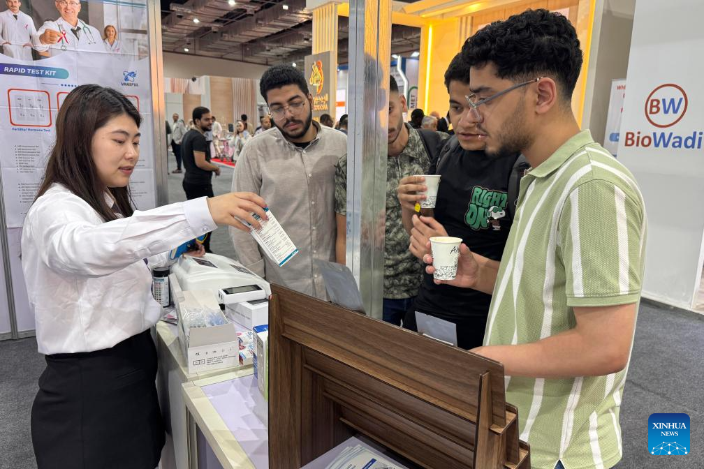 People visit the booth of Chinese pharmaceutical and medical device companies during the fourth Africa Health ExCon in Cairo, Egypt, on June 26, 2025. Dozens of Chinese pharmaceutical and medical device companies are participating in the fourth Africa Health ExCon in Cairo, aiming to expand their presence in Egypt and tap into Africa's growing healthcare market. (Xinhua/Ahmed Gomaa)