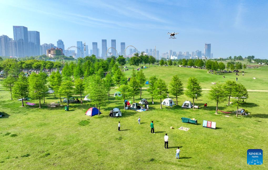 An aerial drone photo taken on April 29, 2024 shows a drone dropping a takeout at Anshang grassland in Hefei, east China's Anhui Province.