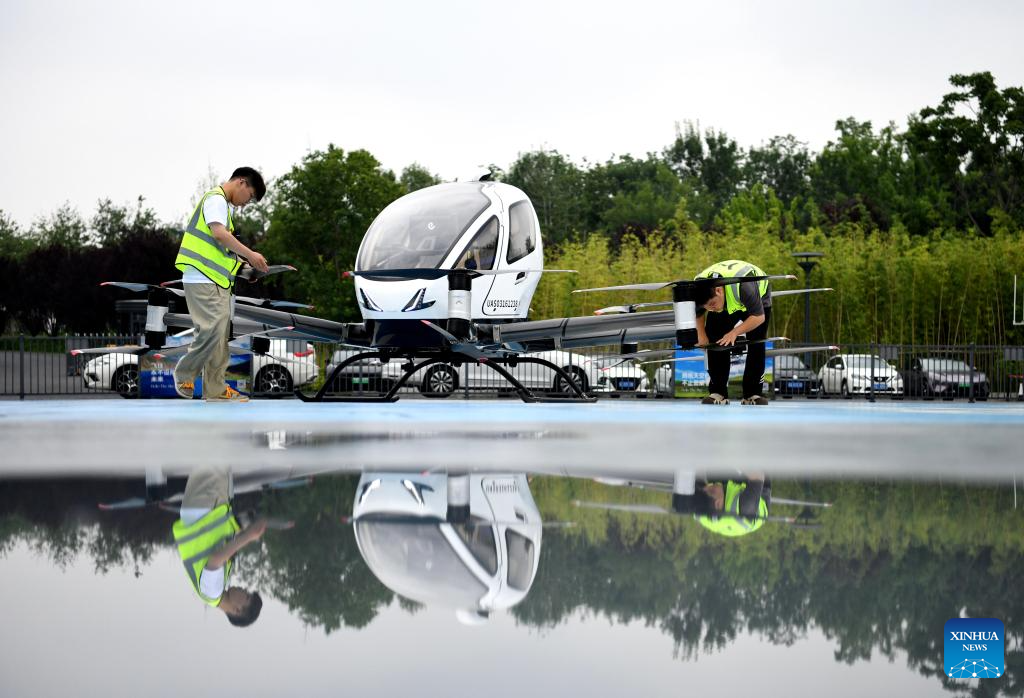 Staff members check an electric vertical take-off-and-landing (eVTOL) aircraft before a flight demonstration at Luogang Park in Hefei, east China's Anhui Province, June 23, 2025.