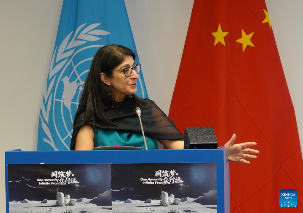Aarti Holla-Maini, director of the UN Office for Outer Space Affairs, speaks at the opening ceremony of an exhibition on China's lunar exploration at the United Nations Office in Vienna, Austria, June 25, 2025. China's lunar samples, collected from both the near and far side of the moon, were exhibited together for the first time at the United Nations (UN) on Wednesday. During the 68th session of the United Nations Committee on the Peaceful Uses of Outer Space (COPUOS), China hosted an exhibition at the UN Office in Vienna showcasing 20 years of its lunar exploration, including samples brought back by the Chang'e-5 and Chang'e-6 missions. (Photo by Wang Zhou/Xinhua)