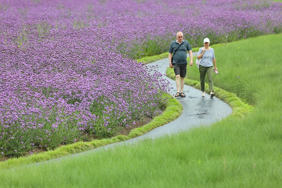 Tourists enjoy flowers at a park in Jiaxing, east China's Zhejiang Province, June 8, 2025. (Photo by Jin Peng/Xinhua)