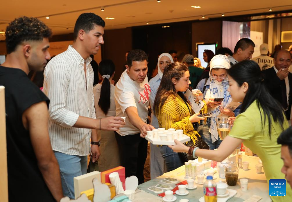 Guests taste tea from China during a cultural and tourism promotion event for southeast China's Fujian Province, in Cairo, Egypt, June 24, 2025. (Xinhua/Wang Dongzhen)