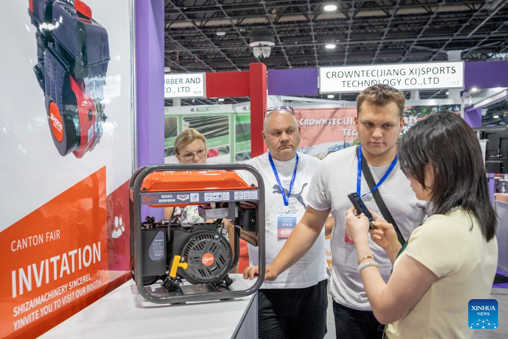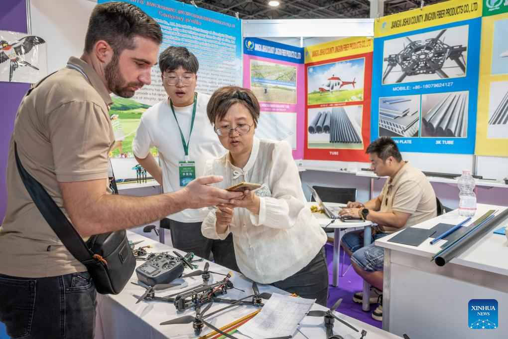 A visitor communicates with Chinese exhibitors at the China Brand Fair in Budapest, Hungary, June 26, 2025. The China Brand Fair 2025 kicked off here on Thursday, bringing together over 270 companies from 17 Chinese provinces and municipalities. Since its inception in 2015, the China Brand Fair has been held seven times in Hungary. The 2025 edition features 10,000 square meters of exhibition space and products spanning electronics, machinery, building materials, fitness equipment, textiles, daily goods, and food items. (Photo by Sandor Bankuti/Xinhua)