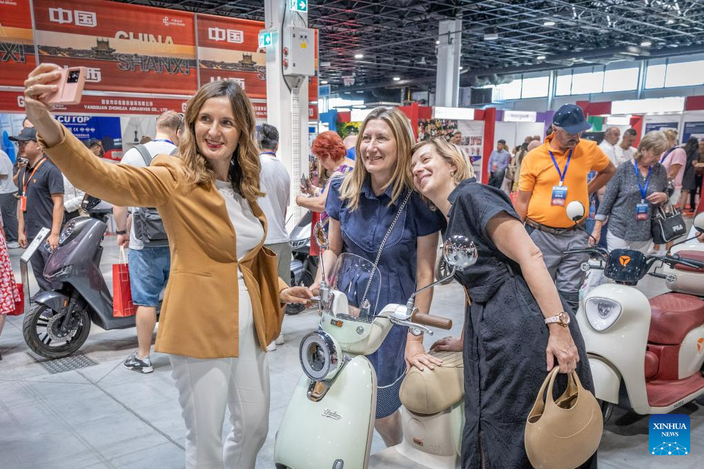 Visitors take a selfie with a Chinese electric motorbike at the China Brand Fair in Budapest, Hungary, June 26, 2025. The China Brand Fair 2025 kicked off here on Thursday, bringing together over 270 companies from 17 Chinese provinces and municipalities. Since its inception in 2015, the China Brand Fair has been held seven times in Hungary. The 2025 edition features 10,000 square meters of exhibition space and products spanning electronics, machinery, building materials, fitness equipment, textiles, daily goods, and food items. (Photo by Sandor Bankuti/Xinhua)