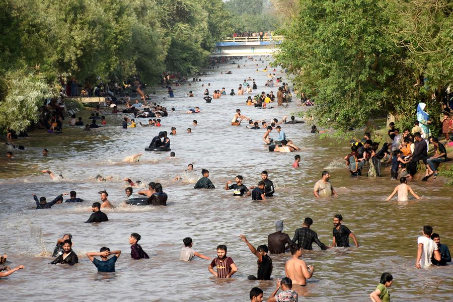 People cool off themselves during a heat wave in a canal in Lahore, Pakistan on June 20, 2025. Temperature reached over 40 degrees Celsius in many cities of Pakistan. (Photo by Sajjad/Xinhua)
