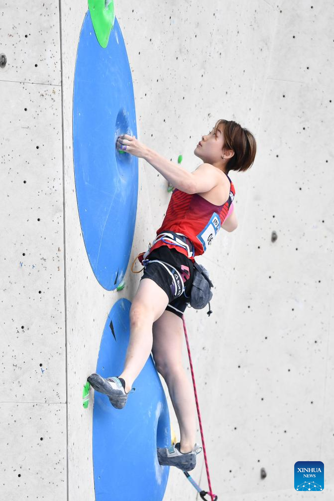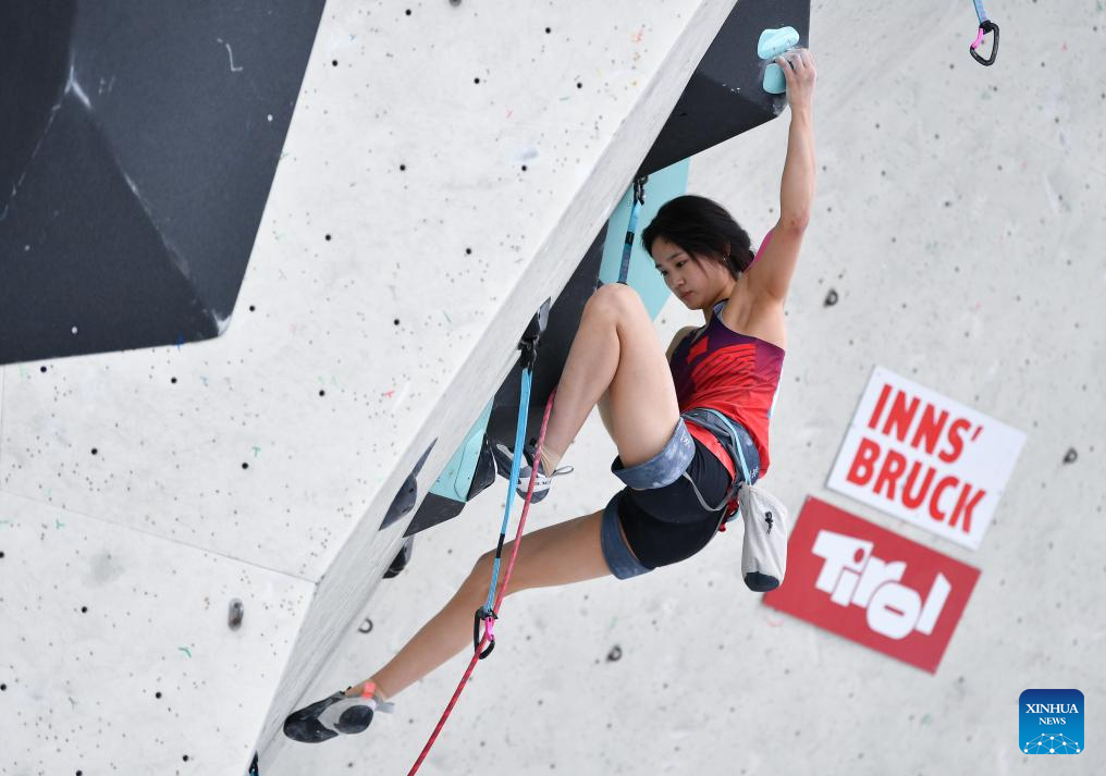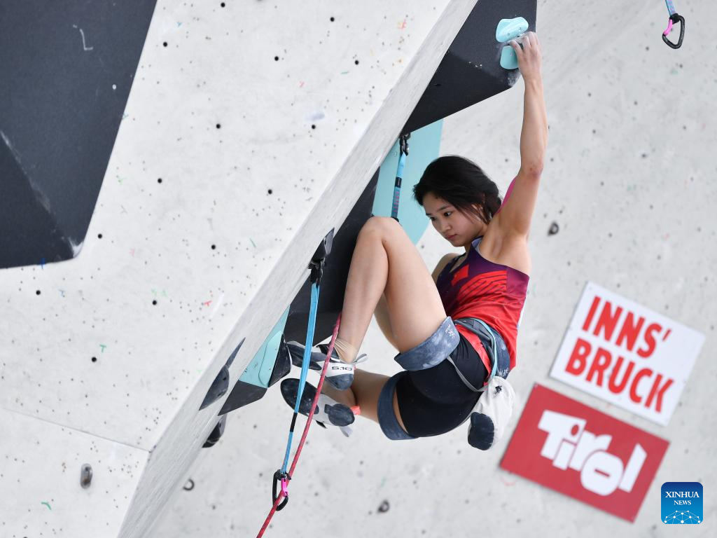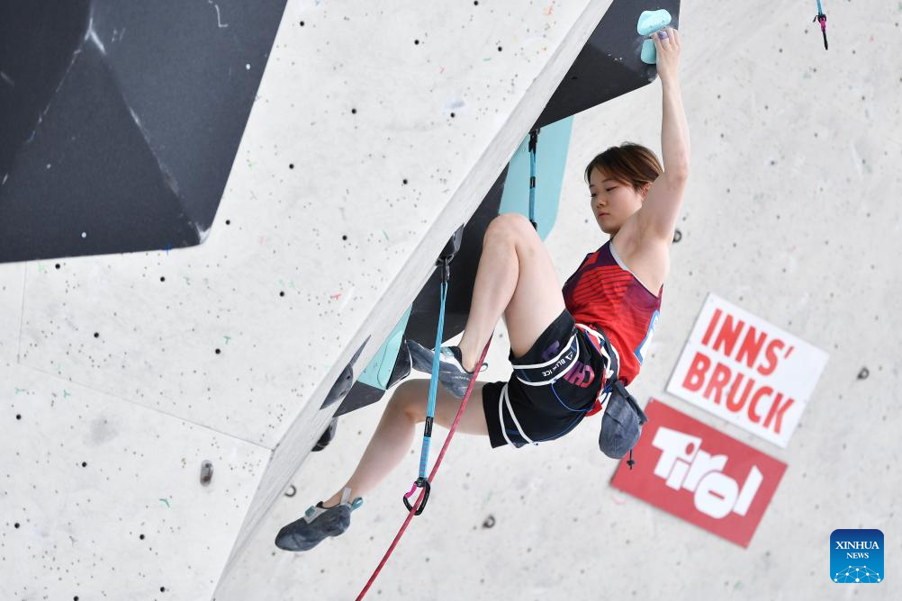 Luo Zhilu of China competes during the women's lead qualification at the International Federation of Sport Climbing (IFSC) World Cup in Innsbruck, Austria, June 28, 2025. (Xinhua/Lian Yi)
