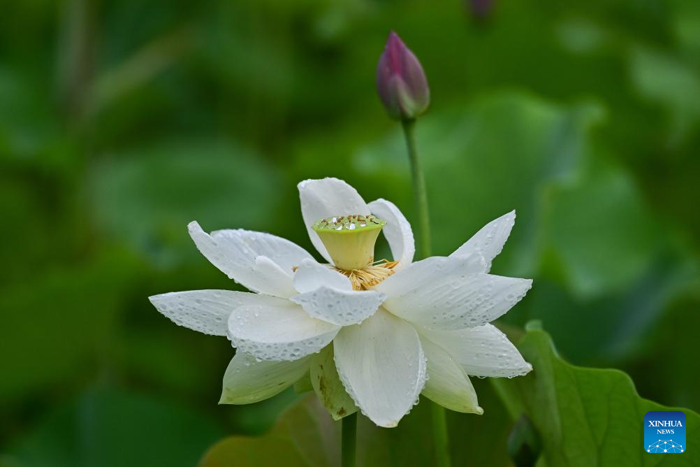 This photo taken on June 27, 2025 shows a lotus flower after rain at a park in Qingzhou City, east China's Shandong Province. (Photo by Wang Jilin/Xinhua)