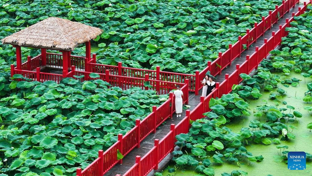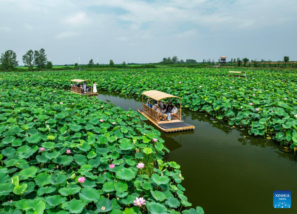 An aerial drone photo taken on June 23, 2025 shows tourists enjoying lotus flowers in Yizheng City, east China's Jiangsu Province. (Photo by Qi Liguang/Xinhua)