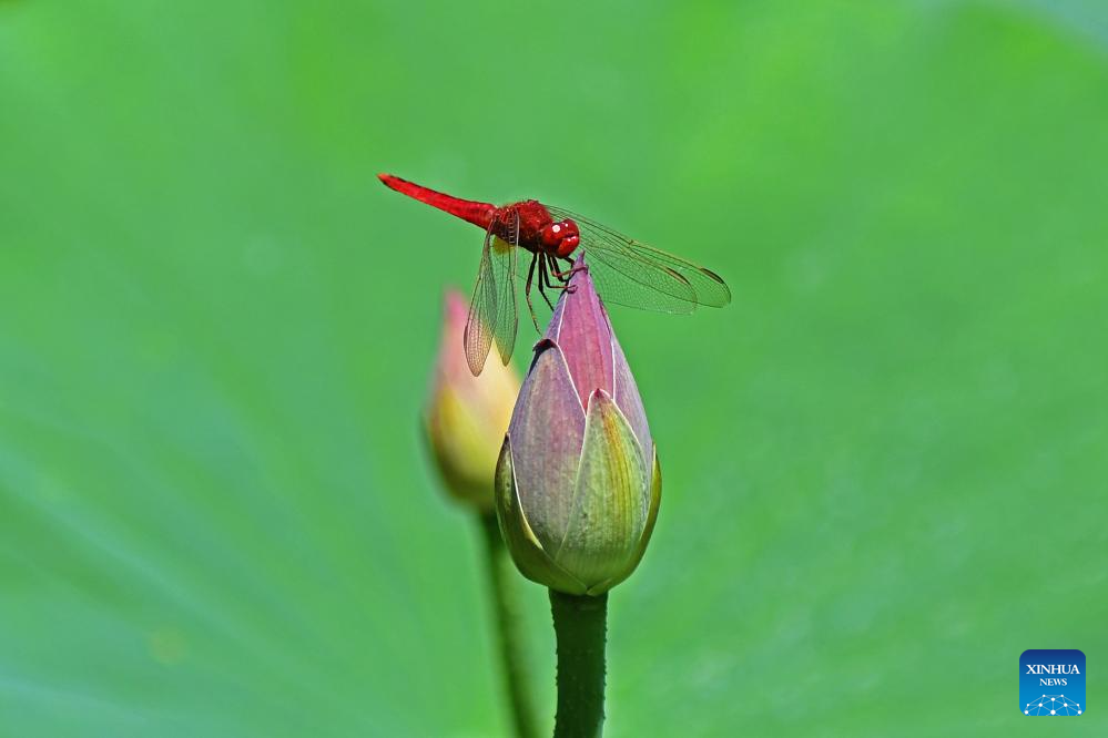 A dragonfly rests on a lotus flower at a wetland park, in Yantai City, east China's Shandong Province, on June 25, 2025. (Photo by Sun Wentan/Xinhua)