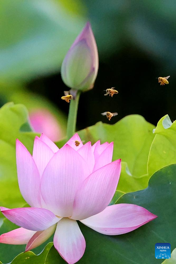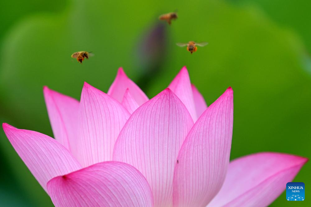 Bees fly among lotus flowers at a lotus pond of a park in Zaozhuang City, east China's Shandong Province, on June 24, 2025. (Photo by Sun Zhongzhe/Xinhua)