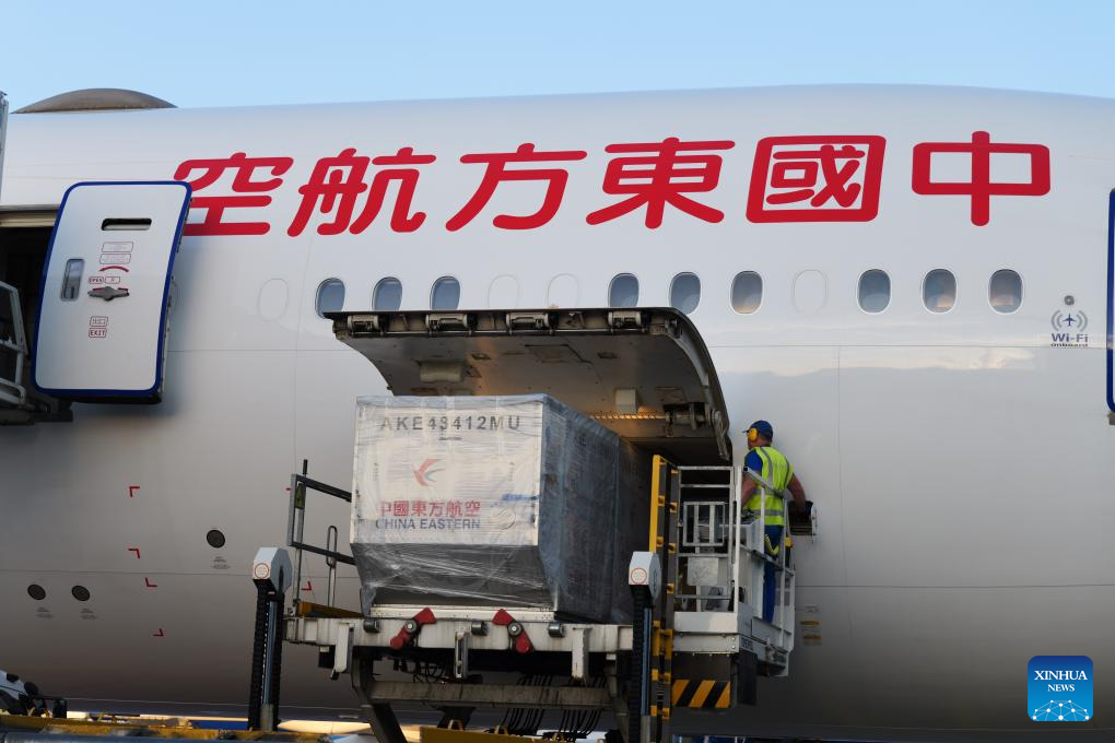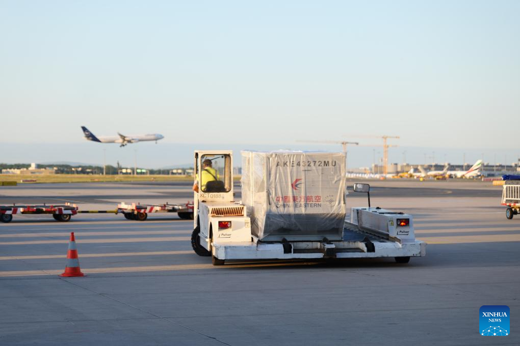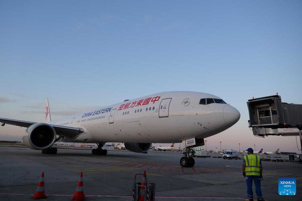 A plane of China Eastern Airlines carrying Dongkui waxberries arrives at Frankfurt airport in Germany, June 24, 2025. (Xinhua/Tai Sicong)