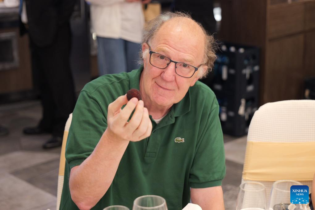 A customer tastes a Dongkui waxberry at a restaurant in Frankfurt, Germany, June 24, 2025. (Xinhua/Tai Sicong)
