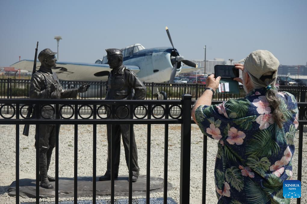 A man takes photos of the sculptures in Los Angeles, the United States, on June 28, 2025. A ceremony unveiling sculptures of "Flying Tigers" was held on Saturday to commemorate the 80th anniversary of the victory in the Chinese People's War of Resistance Against Japanese Aggression and the World Anti-Fascist War. (Photo by Zeng Hui/Xinhua)