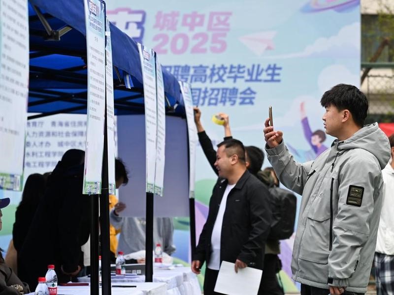 Students learn about recruitment information during a campus job fair held at the Qinghai College of Architectural Technology in Xining, Northwest China's Qinghai province, April 23, 2025. [Photo/Xinhua]