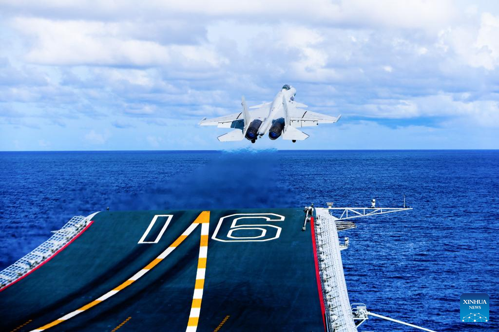 This photo shows a fighter jet taking off from an aircraft carrier. China's naval formations of two aircraft carriers, Liaoning and Shandong, have completed their far-sea combat-oriented training and safely returned to their home ports, according to the Chinese navy on Monday. (Photo by Wang Jian/Xinhua)