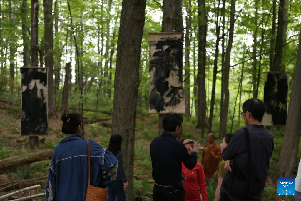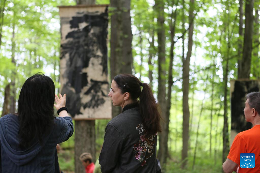 People visit an outdoor exhibition "Solar Terms: Contemporary Ink Art Event" in Lenox, Massachusetts, the United States, on June 28, 2025. In a wooded corner of Eastover Estate & Eco-Village, a dozen tall scrolls, roughly a meter wide and three meters high, sway quietly in summer breeze, having been visibly transformed by rain, snow, sunlight and time since they were installed one year ago. The scrolls were painted on rice paper, affixed to durable non-woven fabric, and then framed and suspended between trees in the forest of the U.S. state of Massachusetts. (Xinhua/Zhang Fengguo)