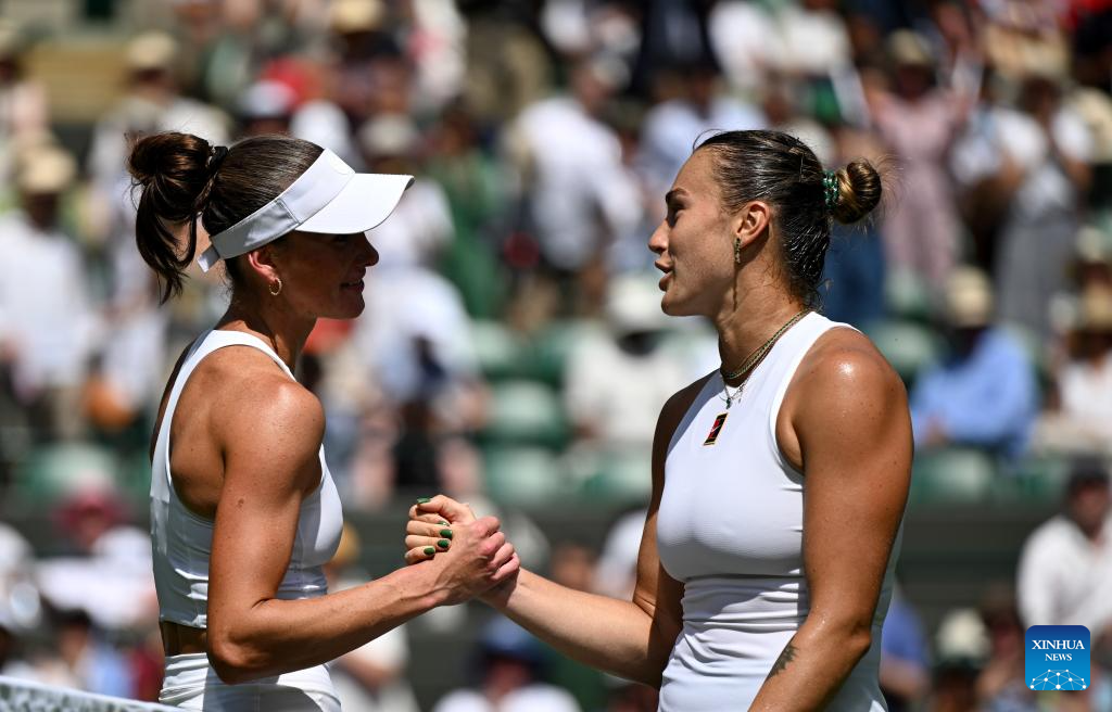 Aryna Sabalenka (R) of Belarus greets Carson Branstine of Canada after their women's singles first round match at Wimbledon tennis Championship in London, Britain, June 30, 2025. (Xinhua/Li Ying)
