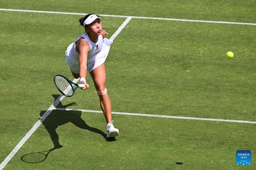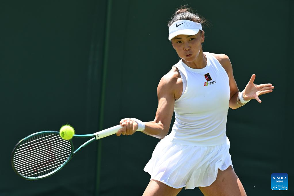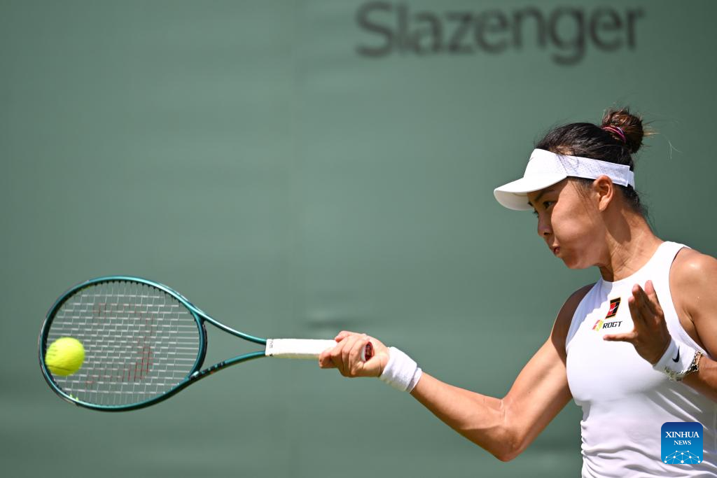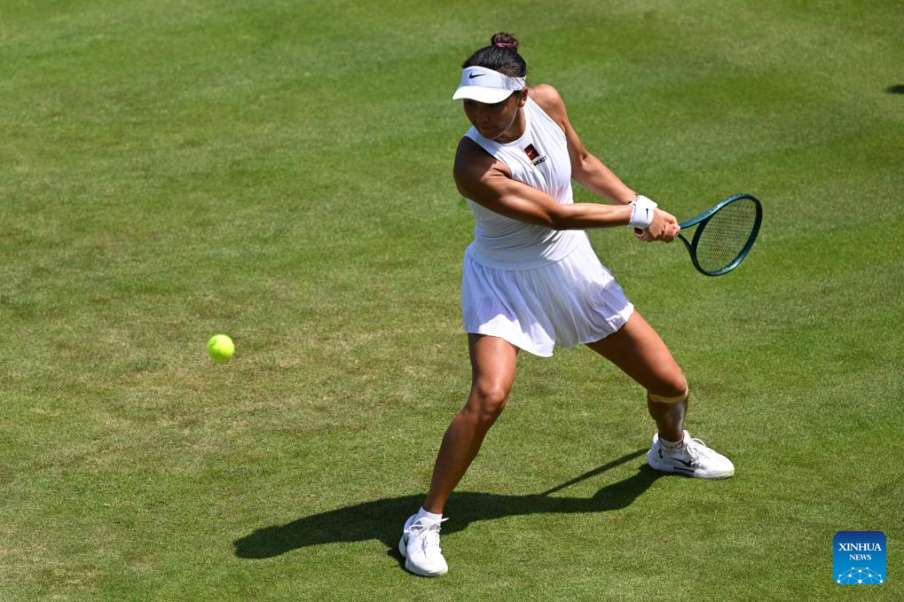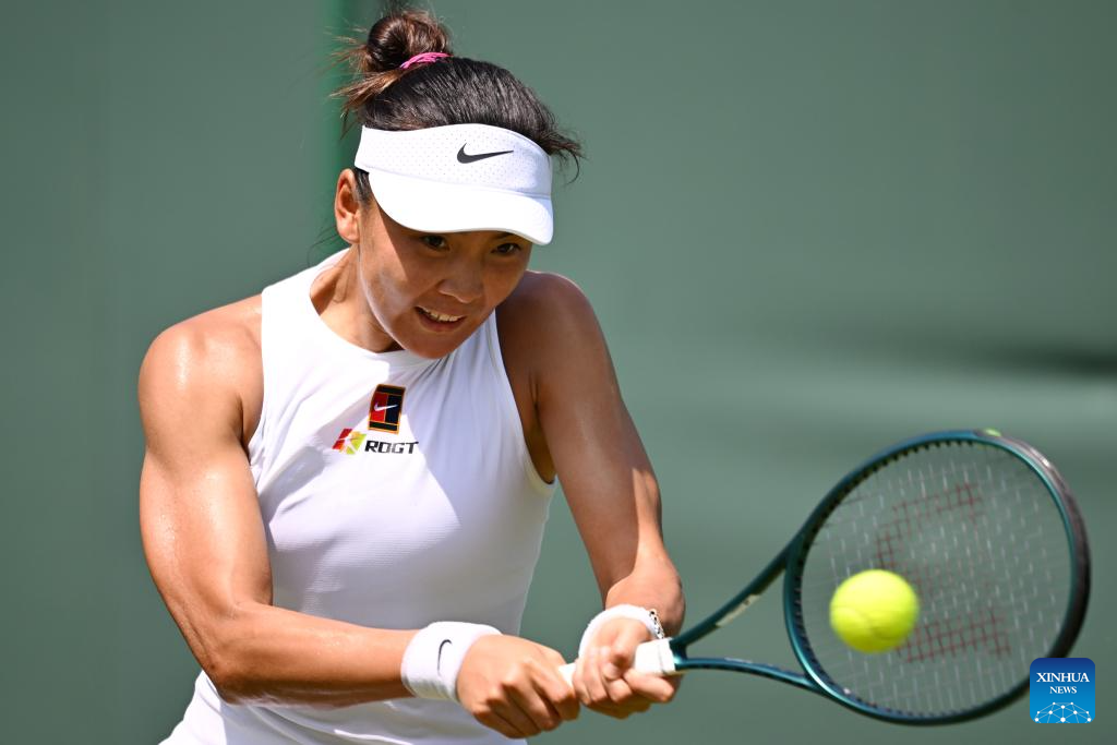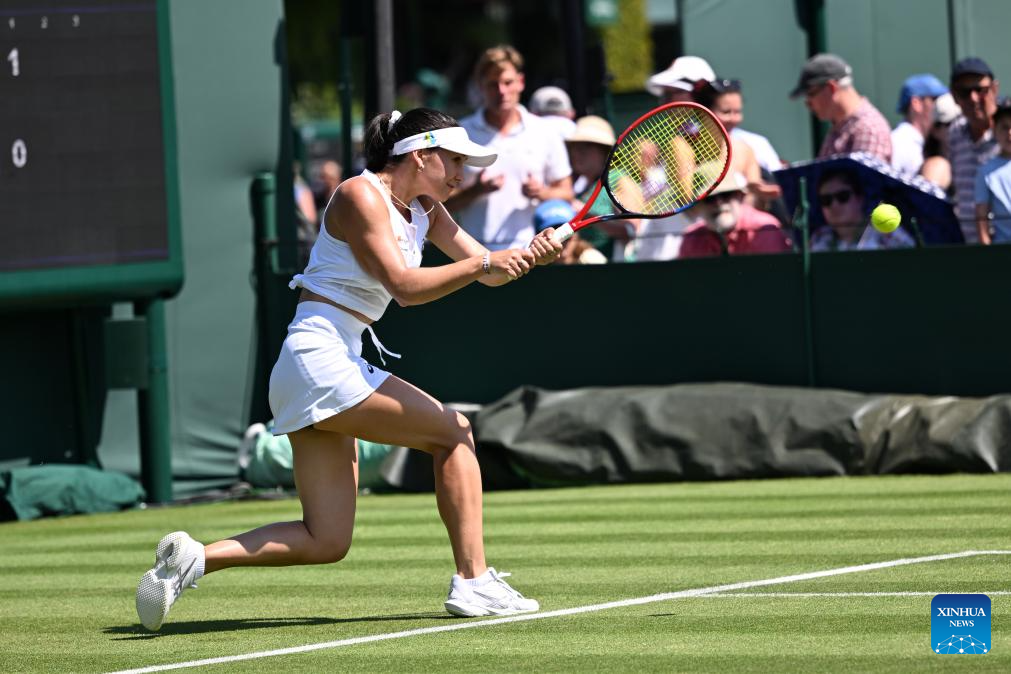 Yuan Yue hits a return during the women's singles first round match between Eva Lys of Germany and Yuan Yue of China at Wimbledon Tennis Championship in London, Britain, June 30, 2025. (Xinhua/Zhao Dingzhe)
