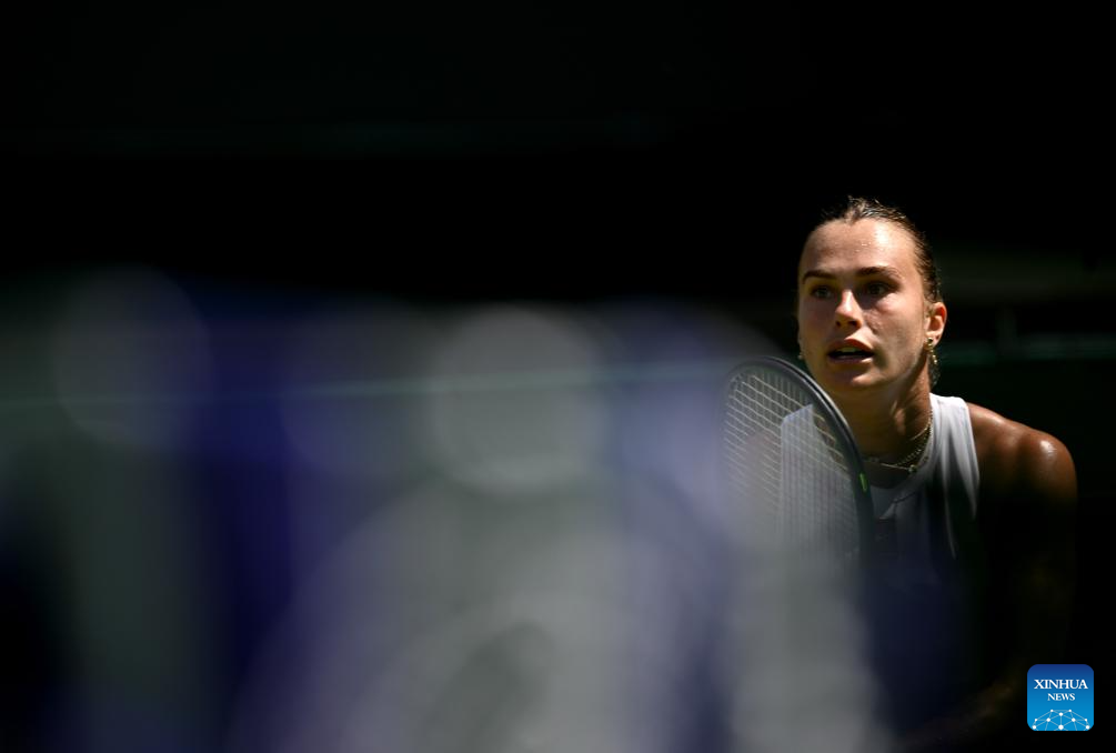 Aryna Sabalenka reacts during the women's singles first round match between Aryna Sabalenka of Belarus and Carson Branstine of Canada at Wimbledon tennis Championship in London, Britain, June 30, 2025. (Xinhua/Li Ying)