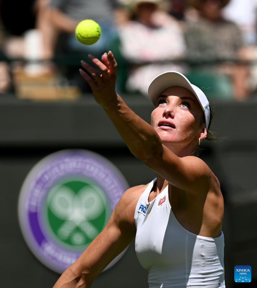 Carson Branstine serves during the women's singles first round match between Aryna Sabalenka of Belarus and Carson Branstine of Canada at Wimbledon tennis Championship in London, Britain, June 30, 2025. (Xinhua/Li Ying)
