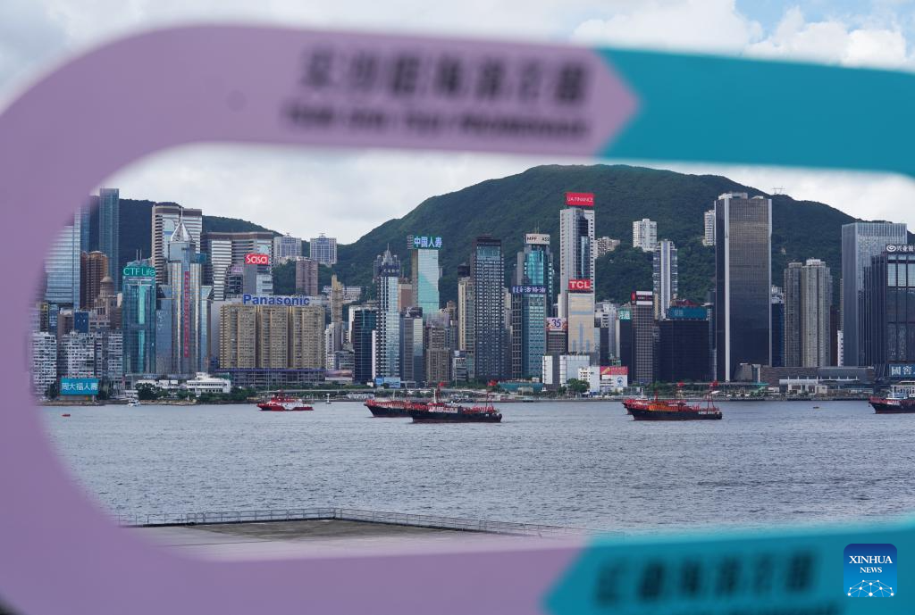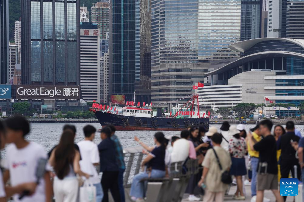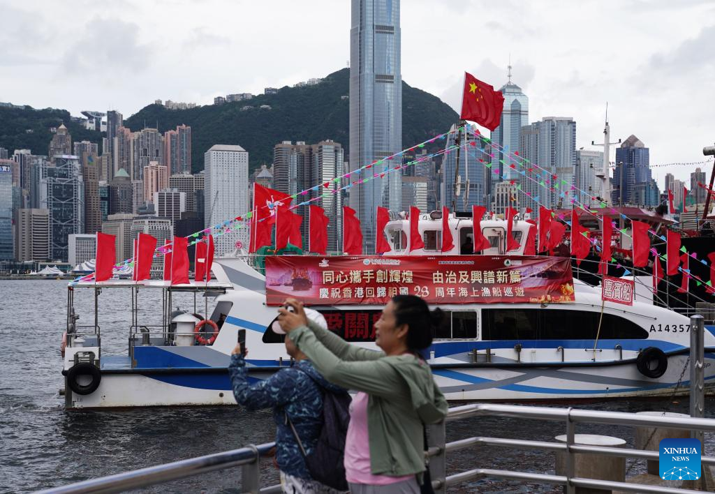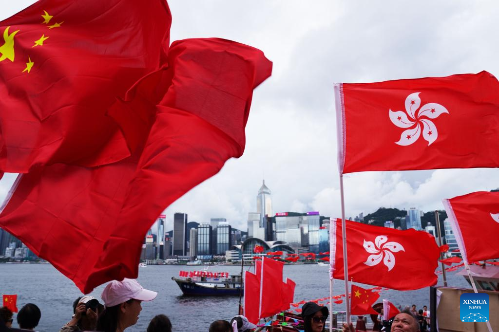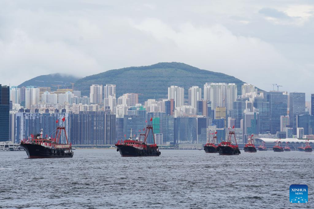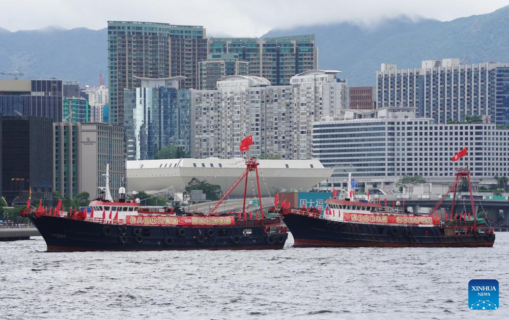 Fishing vessels cruise at Victoria Harbour in Hong Kong, south China, July 1, 2025. Fishing vessels take part in a cruise held by the Hong Kong Fishermen Consortium to celebrate the 28th anniversary of Hong Kong's return to the motherland at Victoria Harbour on Tuesday. (Xinhua/Wang Shen)