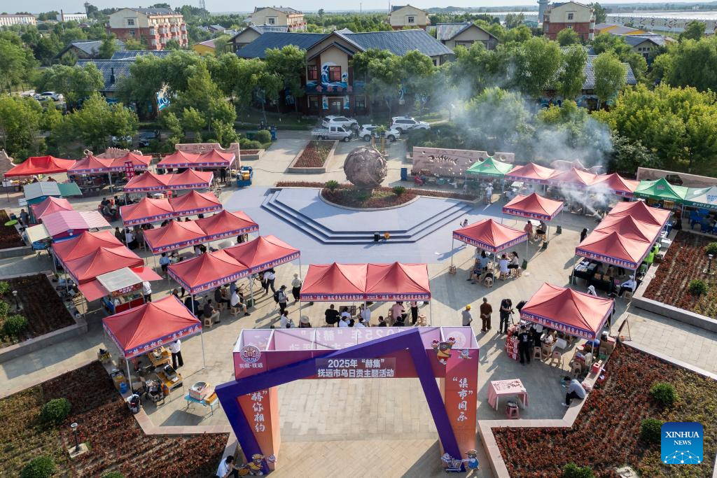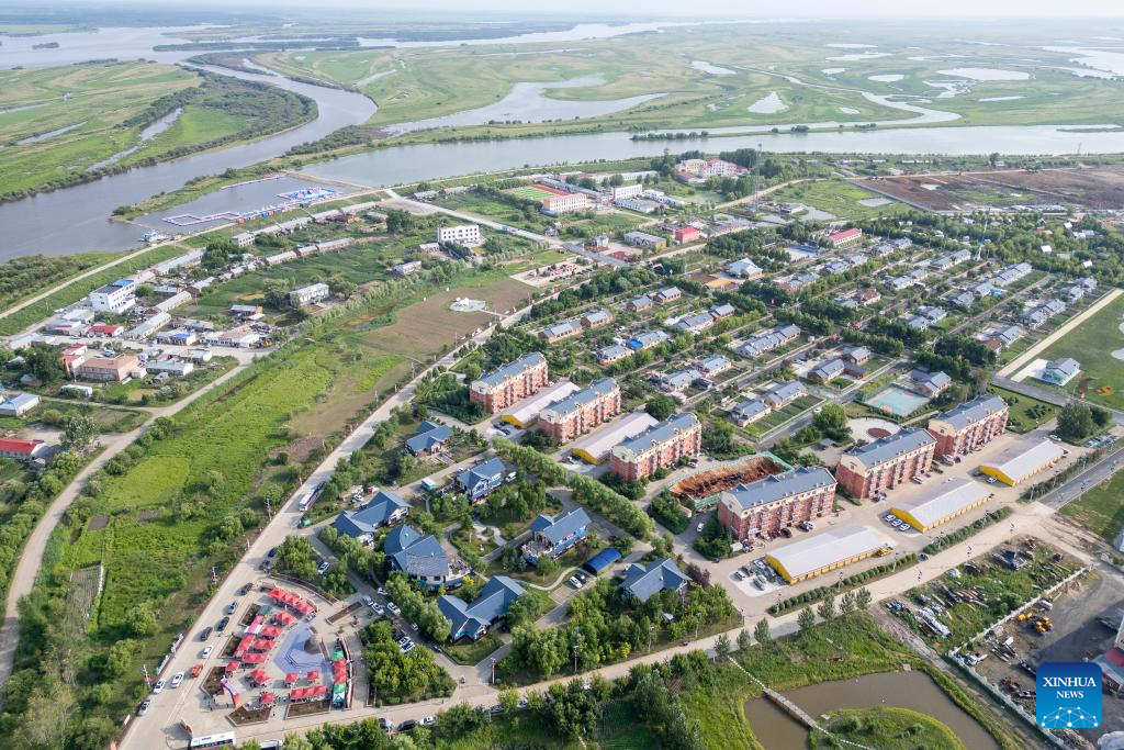 An aerial drone photo shows a view of an event themed with Wurigong in the Hezhe ethnic village of Zhuaji in Wusu Town of Fuyuan City, northeast China's Heilongjiang Province, July 1, 2025. The Hezhe are one of the less populous ethnic groups in China, residing along the Heilongjiang, Songhuajiang and Wusuli rivers. Due to their location in the east, they are known as the "sun watchers."