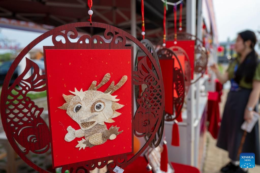 Visitors look at fish skin handicrafts during an event themed with Wurigong in the Hezhe ethnic village of Zhuaji in Wusu Town of Fuyuan City, northeast China's Heilongjiang Province, July 1, 2025. The Hezhe are one of the less populous ethnic groups in China, residing along the Heilongjiang, Songhuajiang and Wusuli rivers. Due to their location in the east, they are known as the "sun watchers."