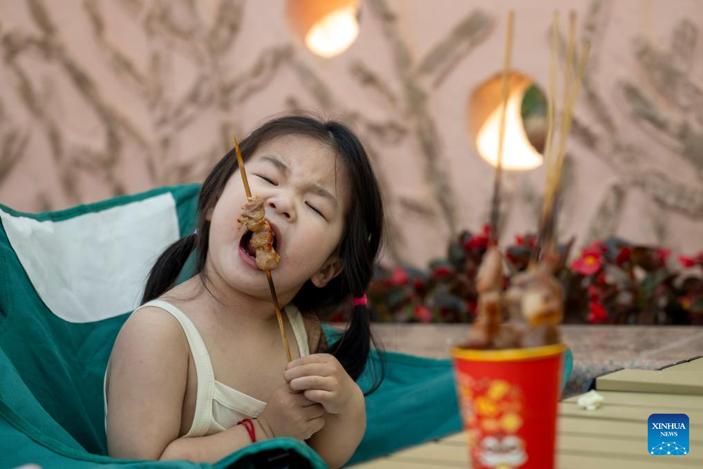 A child eats kebab during an event themed with Wurigong in the Hezhe ethnic village of Zhuaji in Wusu Town of Fuyuan City, northeast China's Heilongjiang Province, July 1, 2025. The Hezhe are one of the less populous ethnic groups in China, residing along the Heilongjiang, Songhuajiang and Wusuli rivers. Due to their location in the east, they are known as the "sun watchers."
