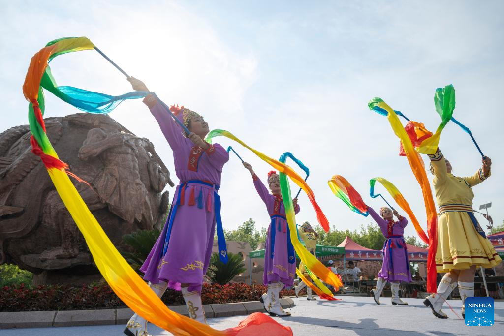 Dancers perform during an event themed with Wurigong in the Hezhe ethnic village of Zhuaji in Wusu Town of Fuyuan City, northeast China's Heilongjiang Province, July 1, 2025. The Hezhe are one of the less populous ethnic groups in China, residing along the Heilongjiang, Songhuajiang and Wusuli rivers. Due to their location in the east, they are known as the "sun watchers."