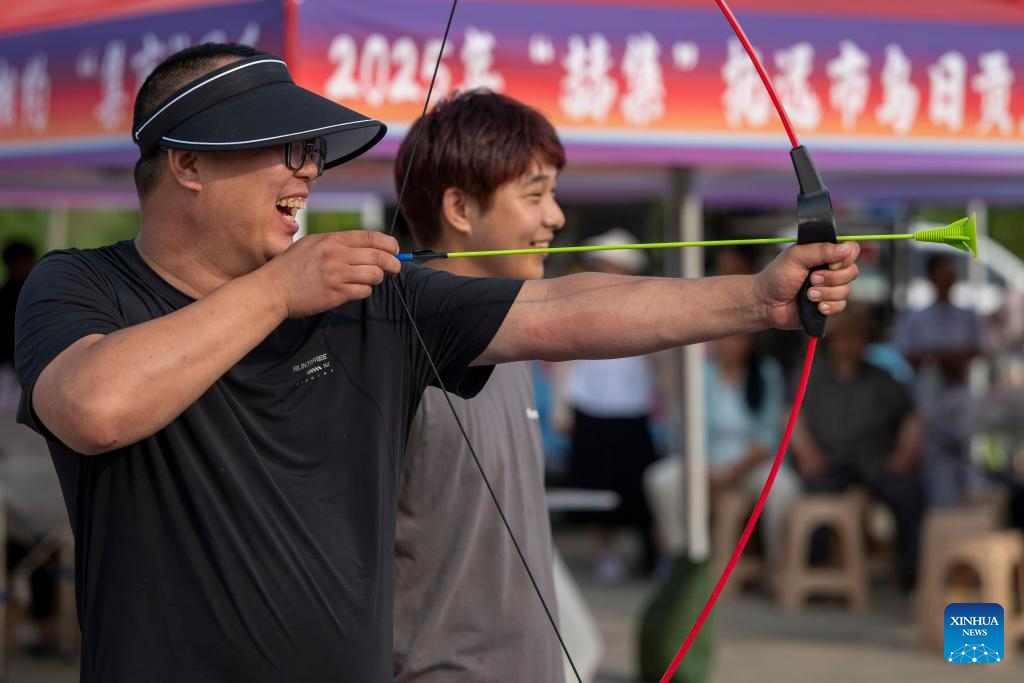 Visitors experience traditional sports during an event themed with Wurigong in the Hezhe ethnic village of Zhuaji in Wusu Town of Fuyuan City, northeast China's Heilongjiang Province, July 1, 2025. The Hezhe are one of the less populous ethnic groups in China, residing along the Heilongjiang, Songhuajiang and Wusuli rivers. Due to their location in the east, they are known as the "sun watchers."