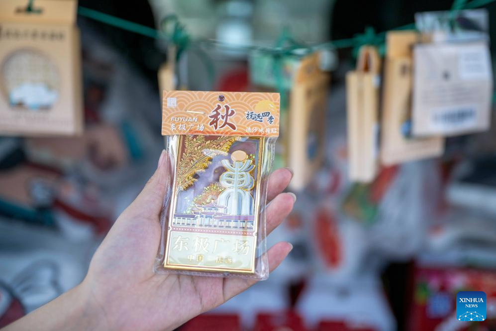 A visitor holds a fridge magnet during an event themed with Wurigong in the Hezhe ethnic village of Zhuaji in Wusu Town of Fuyuan City, northeast China's Heilongjiang Province, July 1, 2025. The Hezhe are one of the less populous ethnic groups in China, residing along the Heilongjiang, Songhuajiang and Wusuli rivers. Due to their location in the east, they are known as the "sun watchers."