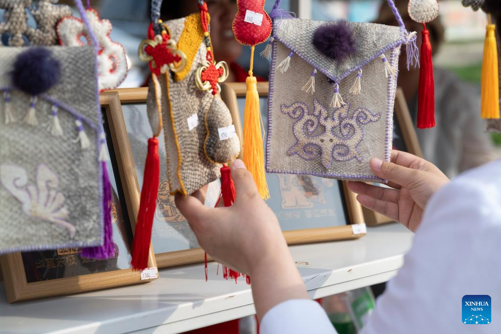 A visitor selects fish skin handicrafts during an event themed with Wurigong in the Hezhe ethnic village of Zhuaji in Wusu Town of Fuyuan City, northeast China's Heilongjiang Province, July 1, 2025. The Hezhe are one of the less populous ethnic groups in China, residing along the Heilongjiang, Songhuajiang and Wusuli rivers. Due to their location in the east, they are known as the "sun watchers."