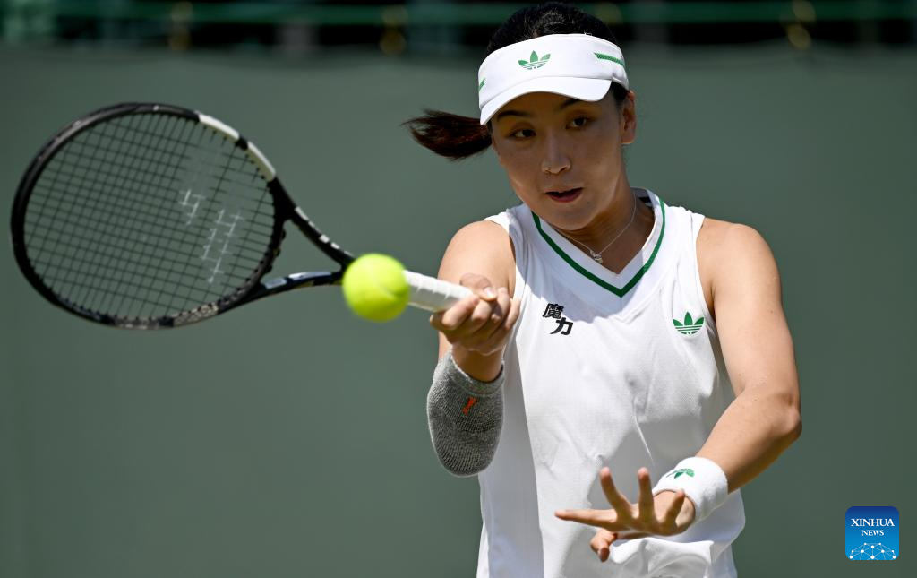 Wang Xinyu hits a return during the women's singles first round match between Wang Xinyu of China and Karolina Muchova of the Czech Republic at the Wimbledon Tennis Championships in London, Britain, July 1, 2025. (Xinhua/Li Ying)
