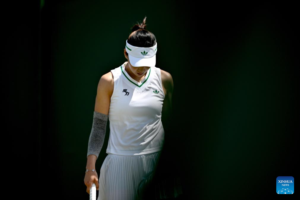 Wang Xinyu reacts during the women's singles first round match between Wang Xinyu of China and Karolina Muchova of the Czech Republic at the Wimbledon Tennis Championships in London, Britain, July 1, 2025. (Xinhua/Li Ying)
