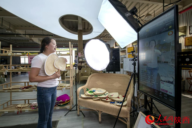 A livestreaming host introduces the craftsmanship of rattan-woven fans during a livestreaming promotion of Shaanxi Liangshun Jiangxin Industry Co., Ltd., a company based in Huangguan town, Nanzheng district of Hanzhong, northwest China's Shaanxi Province. (People's Daily Online/Weng Qiyu)