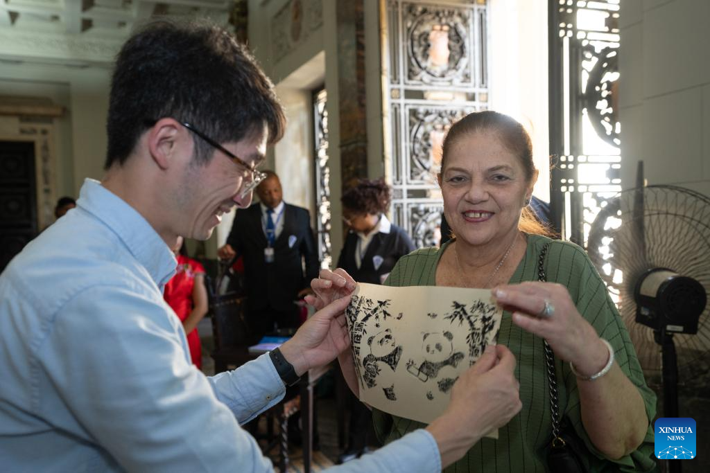 A visitor shows an imprint work during an exposition of innovation in traditional craftsmanship of the east China's city of Hangzhou at Tiradentes Palace in Rio de Janeiro, Brazil, June 30, 2025. The event showcased a variety of Chinese traditional crafts and their innovative expressions to the Brazilian public through demonstrations and interactive experiences. (Xinhua/Wang Tiancong)