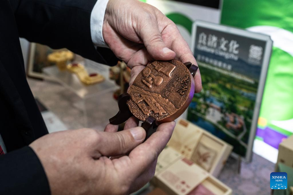 A visitor holds a handicraft featuring the archaeological ruins of Liangzhu, a UNESCO World Heritage site, during an exposition of innovation in traditional craftsmanship of the east China's city of Hangzhou at Tiradentes Palace in Rio de Janeiro, Brazil, June 30, 2025. The event showcased a variety of Chinese traditional crafts and their innovative expressions to the Brazilian public through demonstrations and interactive experiences. (Xinhua/Wang Tiancong)