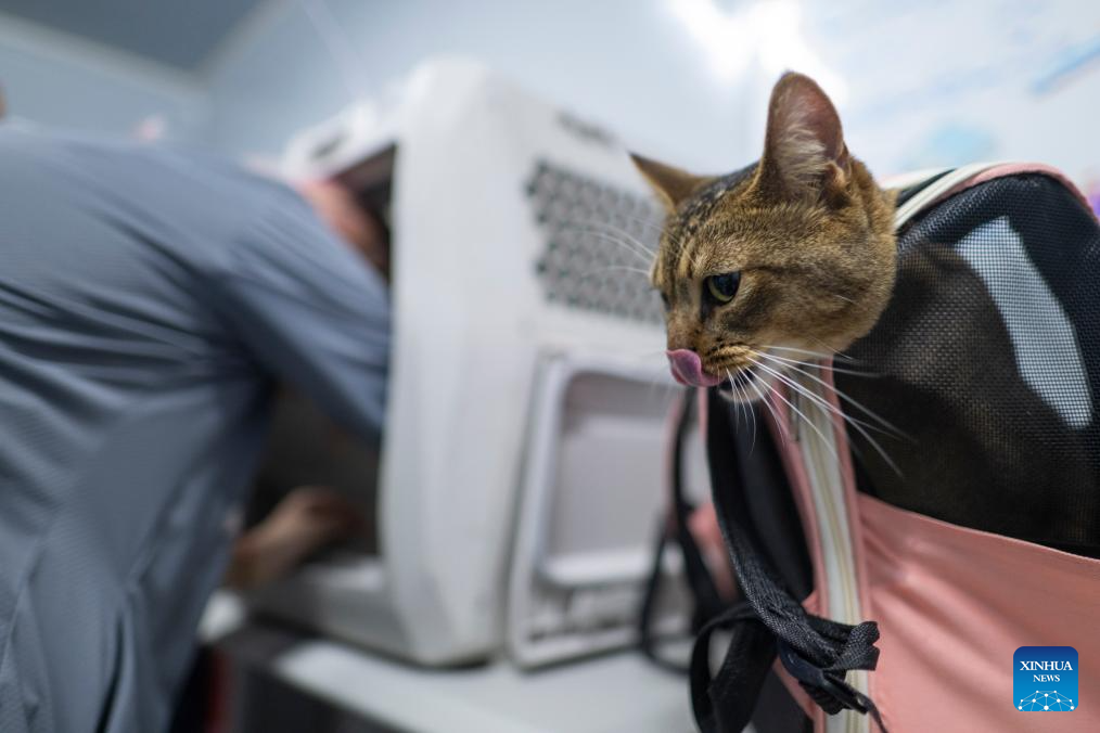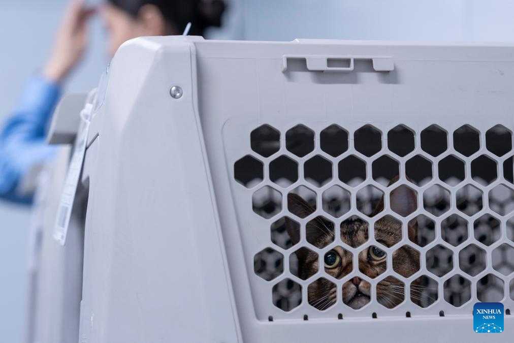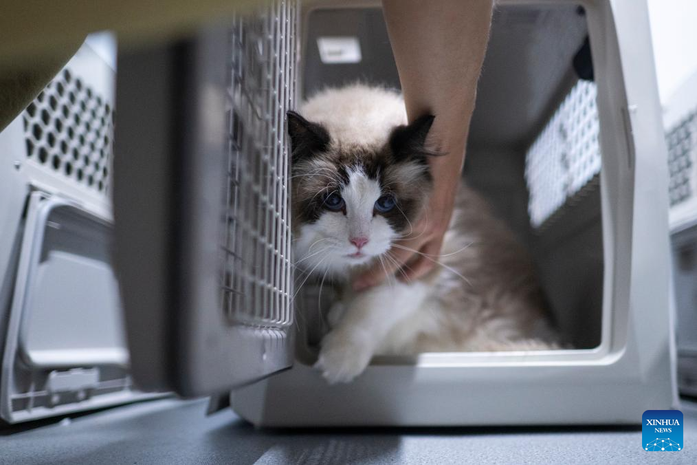 A passenger puts a pet cat in a transport case at Wuhan Railway Station in Wuhan, central China's Hubei Province, July 1, 2025. On the first day of this year's summer travel rush, some qualified domesticated cats and dogs boarded on bullet trains accompanying their owners in Wuhan on Tuesday, as the pilot pet consignment service on high-speed railways expanded its scope from June 20.