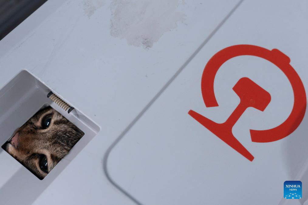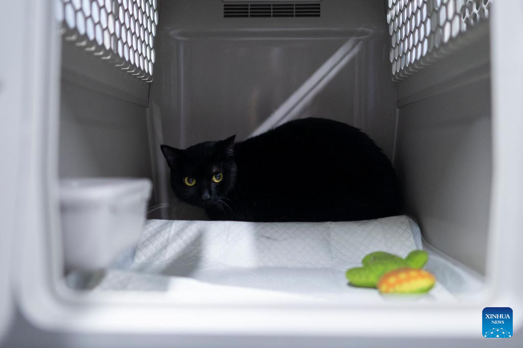 A pet cat is pictured in a transport case at Wuhan Railway Station in Wuhan, central China's Hubei Province, July 1, 2025. On the first day of this year's summer travel rush, some qualified domesticated cats and dogs boarded on bullet trains accompanying their owners in Wuhan on Tuesday, as the pilot pet consignment service on high-speed railways expanded its scope from June 20.